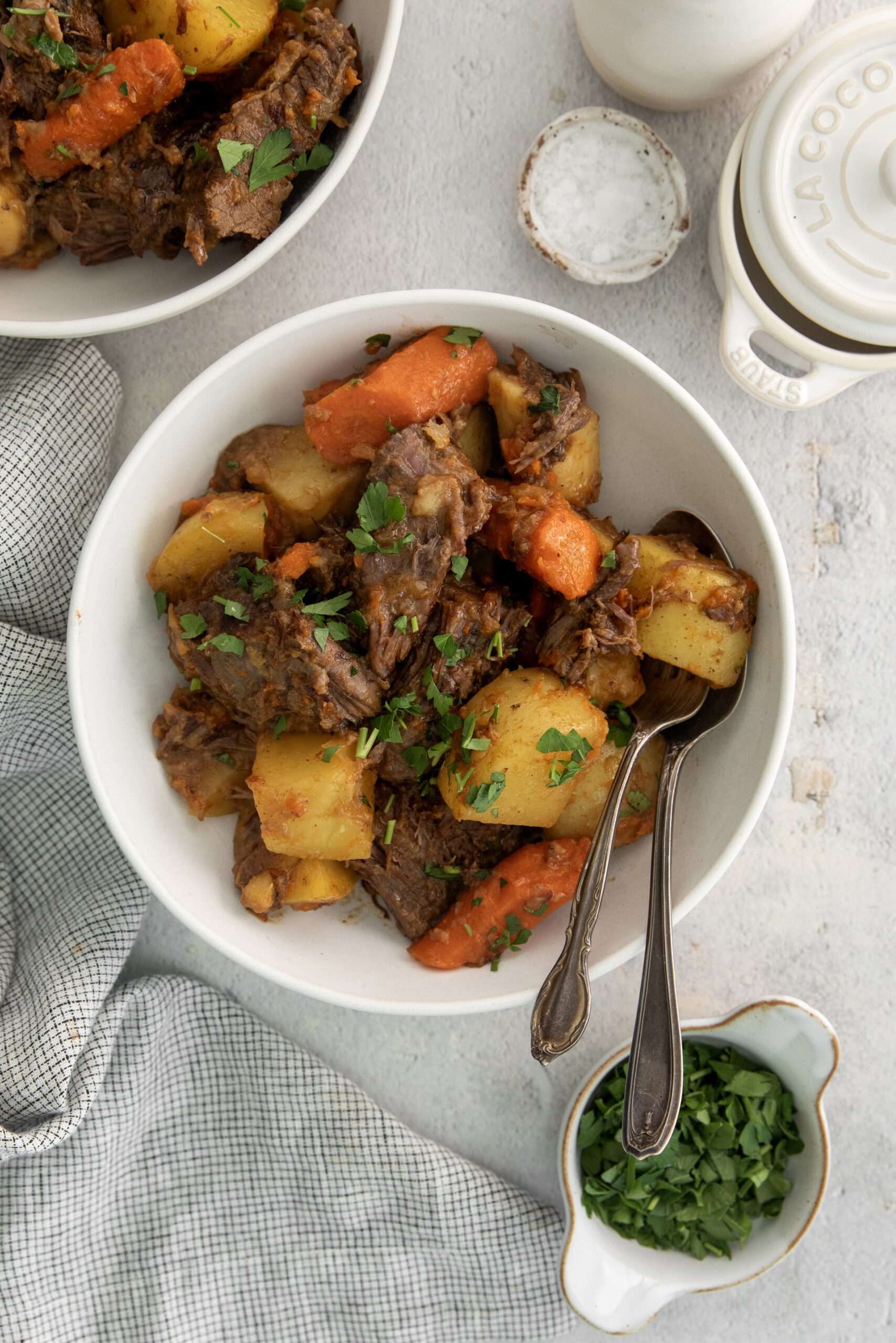 0 An hour before cooking, bring the beef to room temperature. This will help you get a nice crust when you sear it. 4 Heat a large dutch oven over medium-high heat. 1 Season the beef with salt and pepper all over, patting it into the flesh well. 3 Cover the beef with the flour, also patting it in well. 2 Add lard or oil to the hot pan. 5 Brown beef in the pan on all sides, cooking for 3-5 minutes per side so a crust forms before turning. 6 Add the cipolini onions and nestle into the bottom of the pan with the beef, browning them for 5-10 minutes. 7 Add carrots, parsnips, bay leaves, thyme, and stock. 8 Cover, lower the heat, and cook on low for 2 1/2 hours. 9 Remove the lid and add the potatoes, stirring a bit to cover in the cooking liquids. 10 Cover the pot and continue to cook for another 30 minutes, or until potatoes are tender when pierced with a fork. 11 Remove from heat and transfer meat to a cutting board. Cut the meat, though it will barely need to be cut, it will be tender enough that it will pull apart. 12 Plate beef with the vegetables and potatoes and spoon the cooking sauce on top. Garnish with parsley and serve.View original recipe