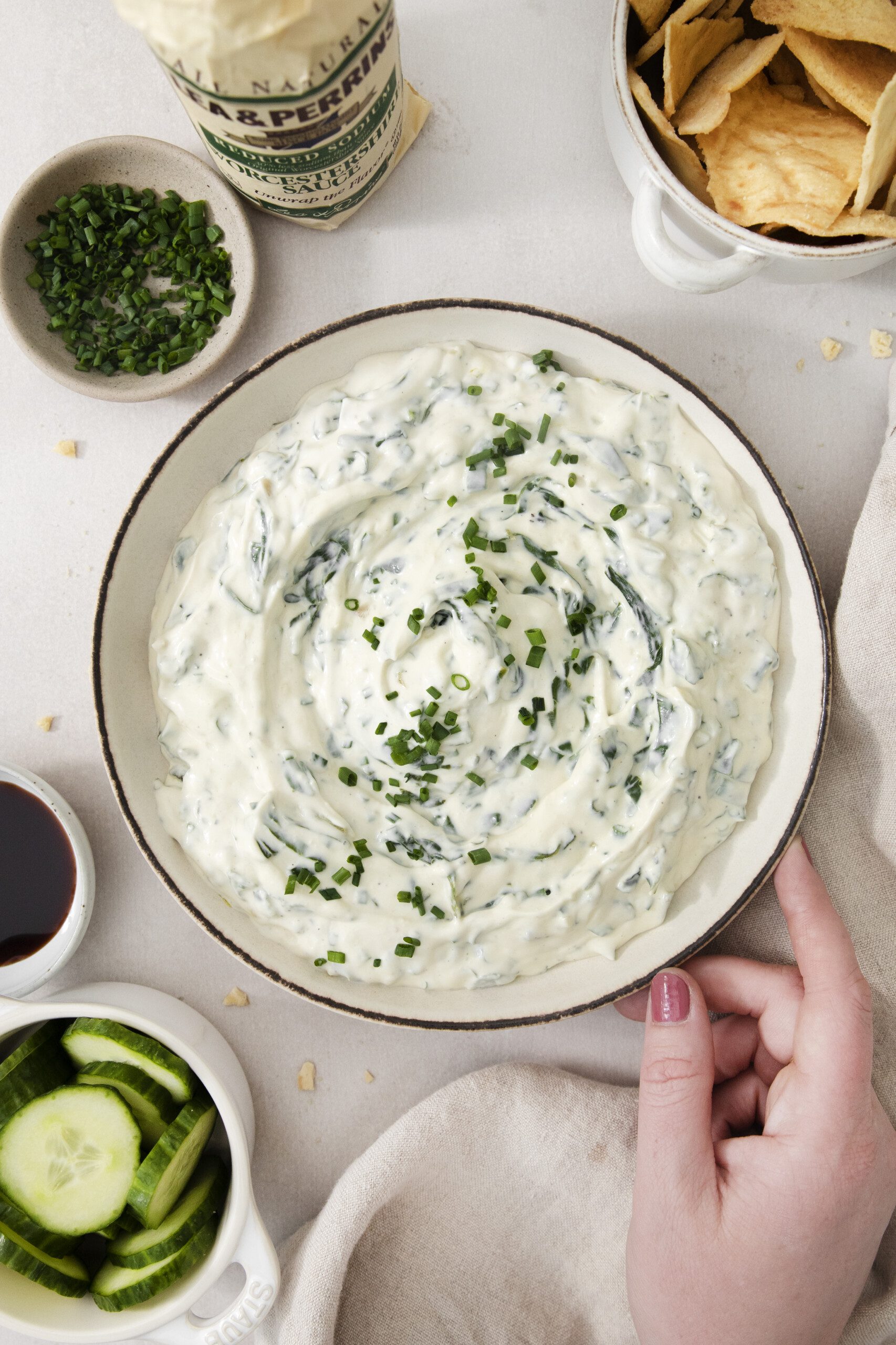 0 Set a large, deep sided saute pan over medium heat. Add 2 tablespoons of olive oil. 1 Saute the garlic for 30 seconds, stirring, until lightly golden. 2 Add the swiss chard with ¼ teaspoon of salt (you’ll use the rest of the salt later) and cook, stirring, for 3-5 minutes until soft. The swiss chard will cook down quite a bit, so don’t be afraid to overfill the pan. Once the chard is soft, set aside to cool. 3 In a large bowl, mix together the sour cream, mayonnaise, onion powder, garlic powder, ½ teaspoon salt, pepper, mustard, and worcestershire. 4 When cooled, mix in the swiss chard mixture and chives. 5 To serve, spread the dip in a shallow bowl or platter and sprinkle with more chives a drizzle of extra virgin olive oil. . 6 Serve with pita chips, crackers, and/or sliced fresh vegetables.View original recipe